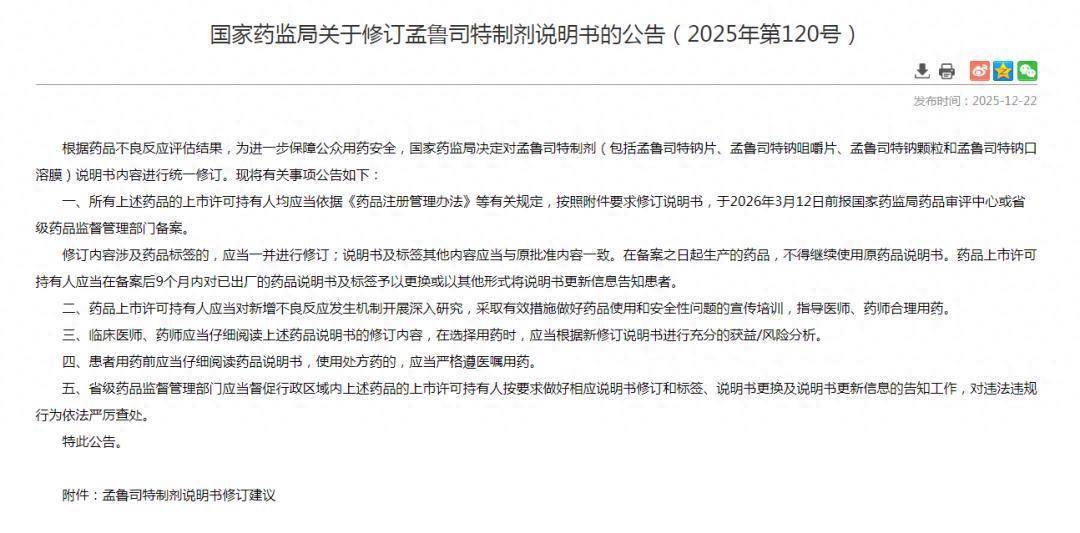 12月22日,国度药监局对于革命孟鲁司特制剂阐扬书的公告(2025年第120号)凭证药品不良响应评估服从,为进一步保险公众用药安全,国度药监局决定对孟鲁司特制剂(包括孟鲁司特钠片、孟鲁司特钠咀嚼片、孟鲁司特钠颗粒和孟鲁司特钠口溶膜)阐扬书骨子进行调解革命。